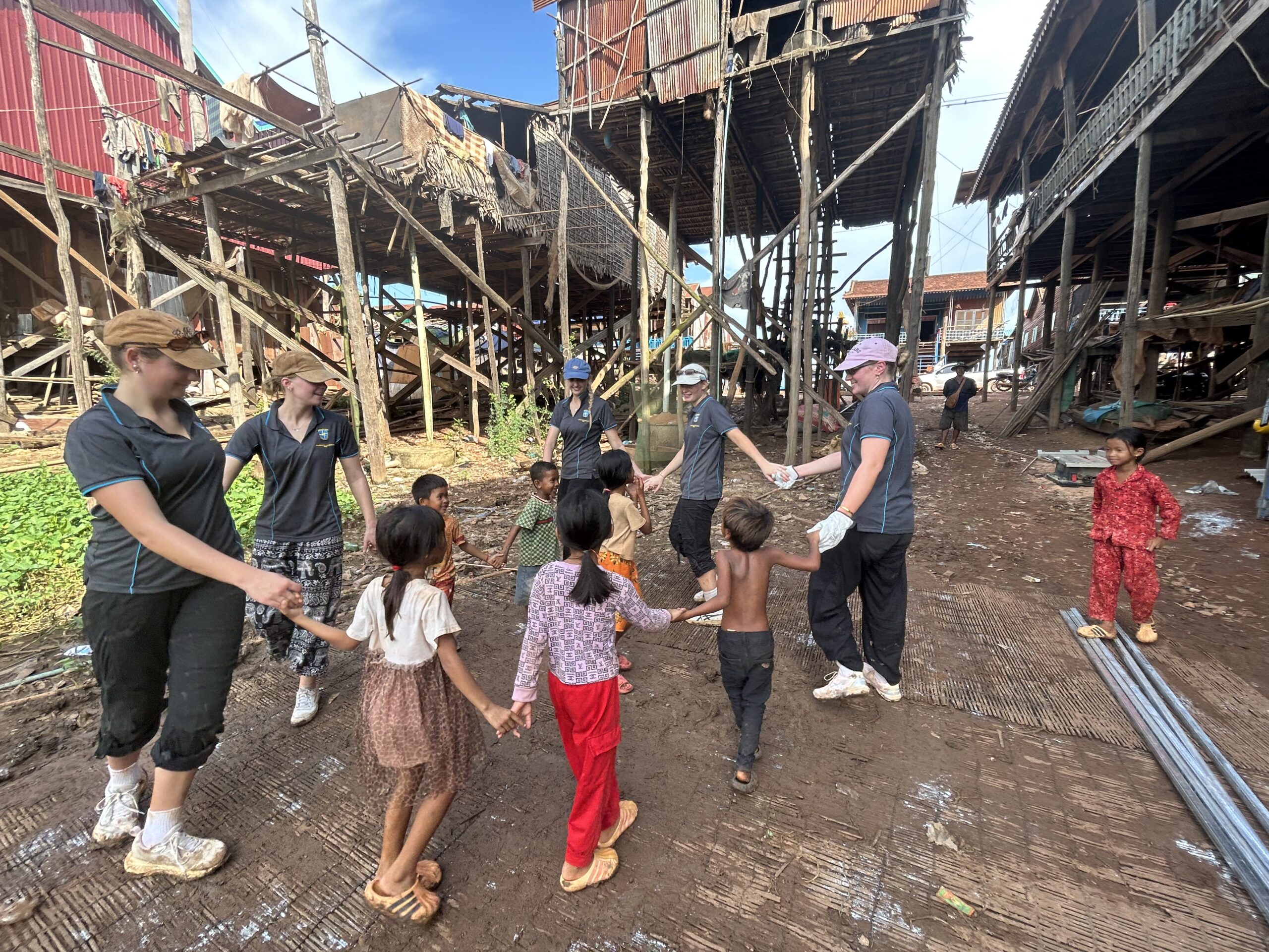 After lunch, we took an hour-long bus ride to Kampong Kleang, a small fishing village that transforms during the rainy season – the homes appear to float as the water rises. When we arrived, we met the family we’d be helping – nine people living in a leaky hut that couldn’t withstand the floods. During the wet season, they were forced out, essentially becoming homeless. Meeting them in person made everything feel very real.