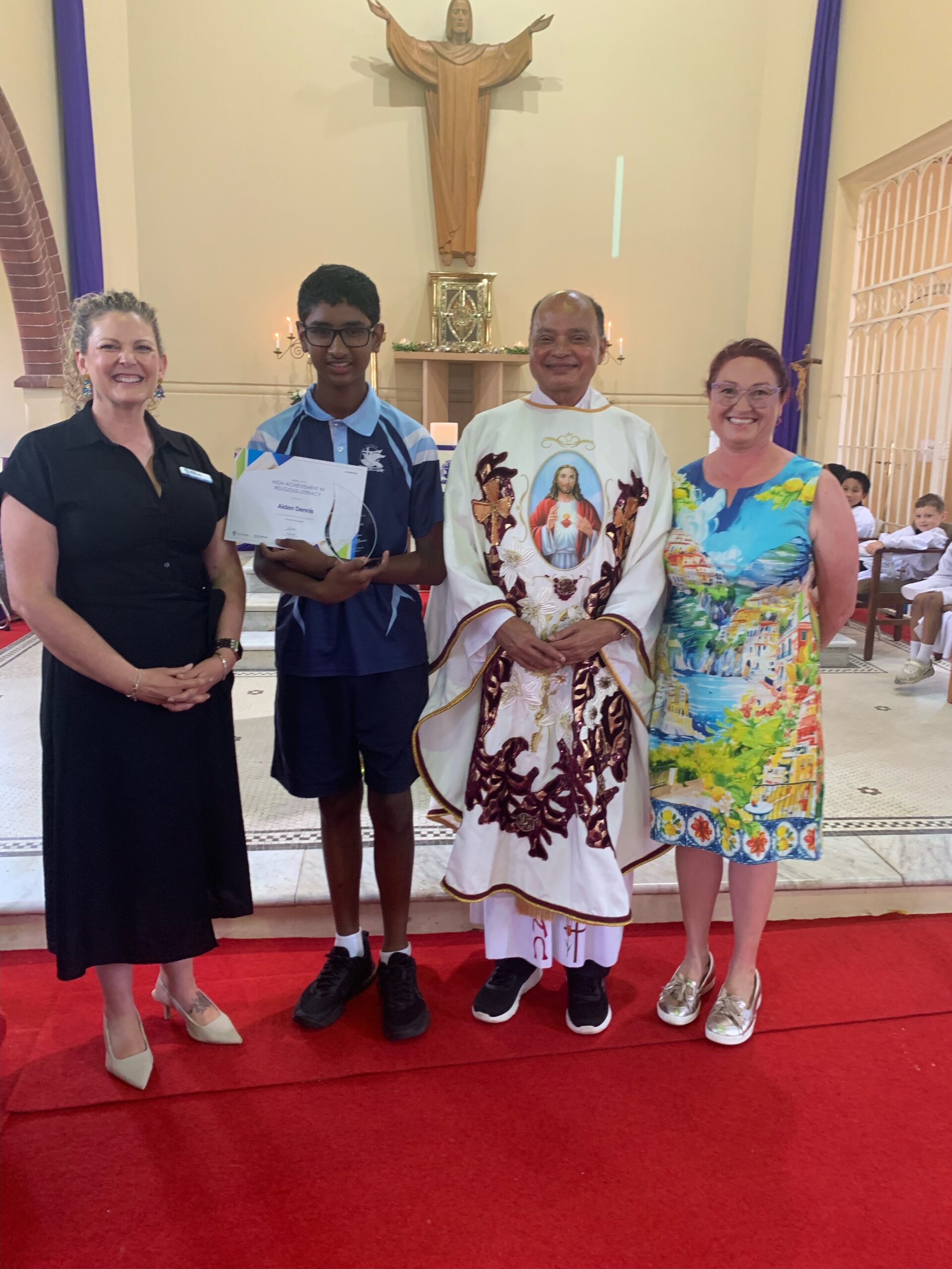 - Aiden Dennis, St John’s Lambton with Karli Chenery, Education Officer – Primary Curriculum, Fr Velerian D’Souza and Mel Nunn