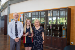 - Isabella Robinson, Trinity Catholic College, Adamstown with Principal Robert Emery and Leader of Learning Simone Kelly