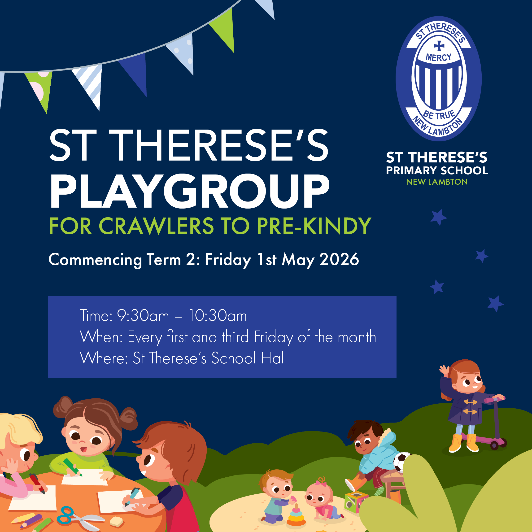 St Therese's invites families to come and be part of their playgroup. From crawlers to pre-kindy the Playgroups will run Every first and third Friday of the month.
